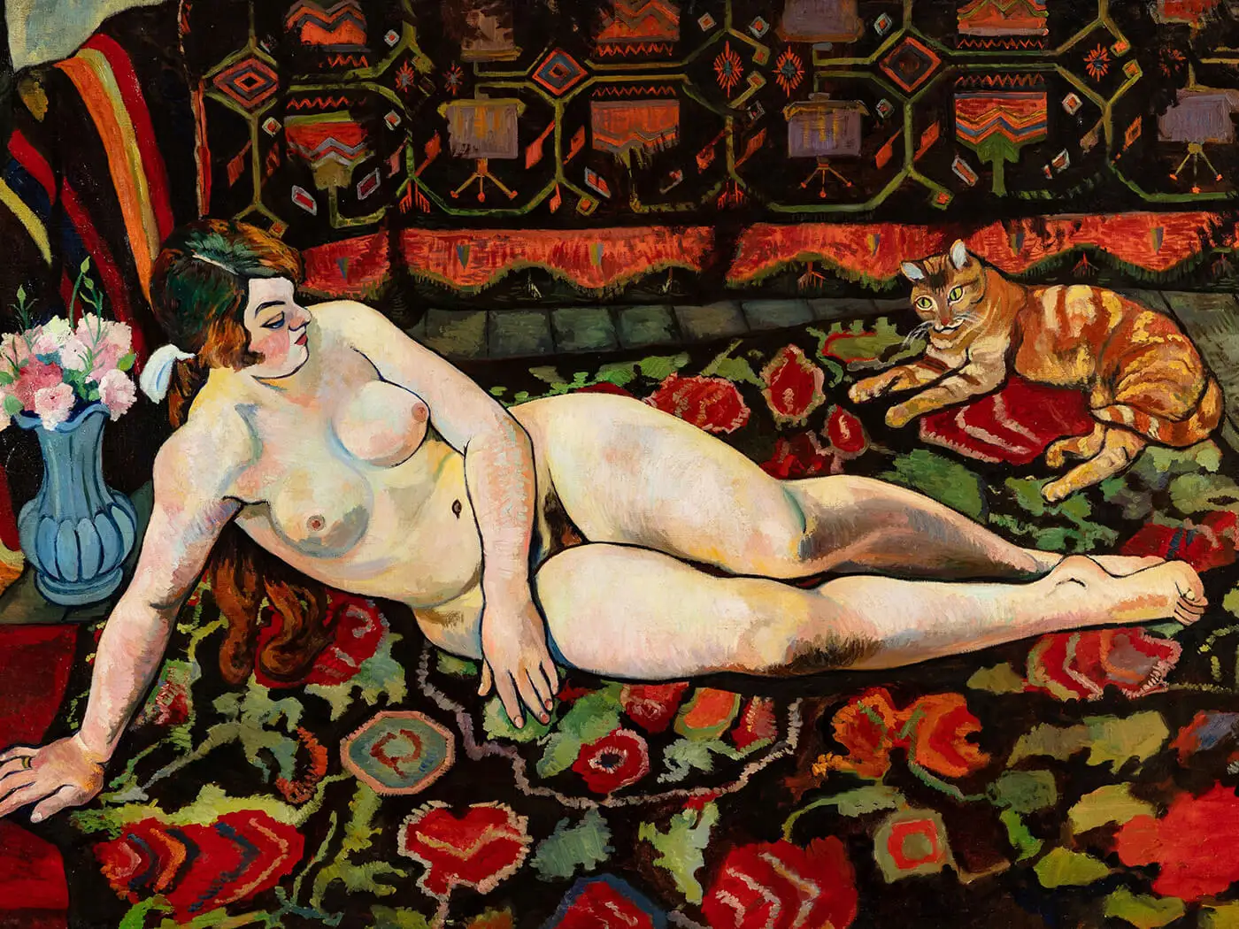 Nu au chat, allongé sur une draperie à fleurs, 1920